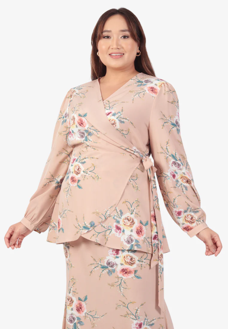 Wardani Raya Floral Prints Wrap Kurung Set - Nude Rose