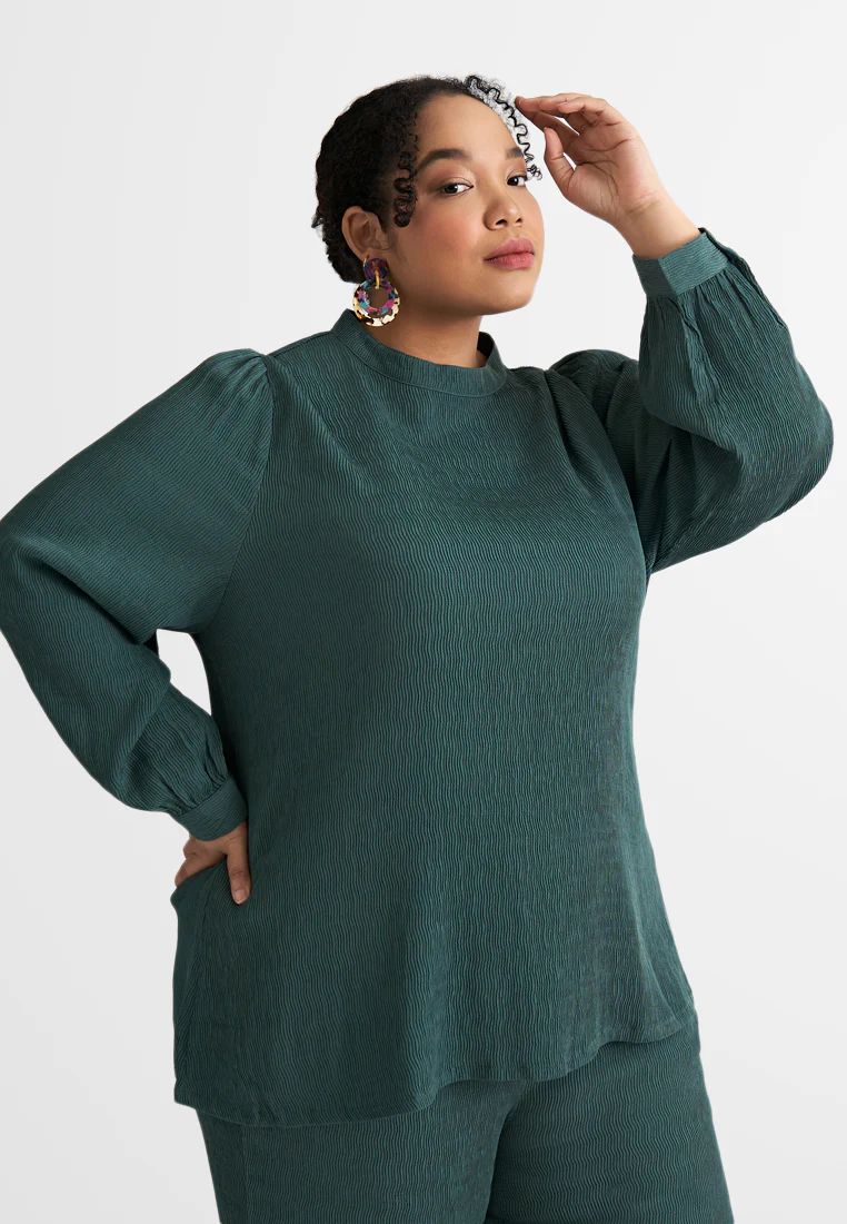 High mock neck - Back neck button - Puff long sleeves - Wrist cuff with button