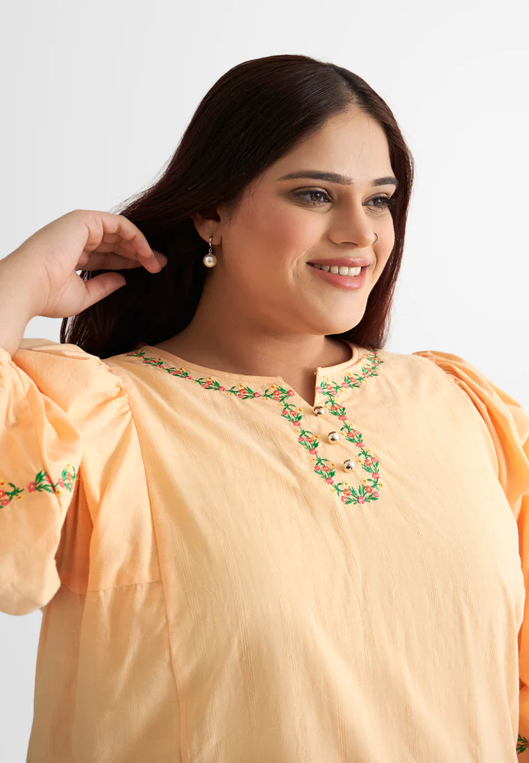 With its intricate embroidery and puff sleeves, this blouse becomes more than just an item in your wardrobe; it becomes a symbol of your appreciation for classic, feminine fashion.